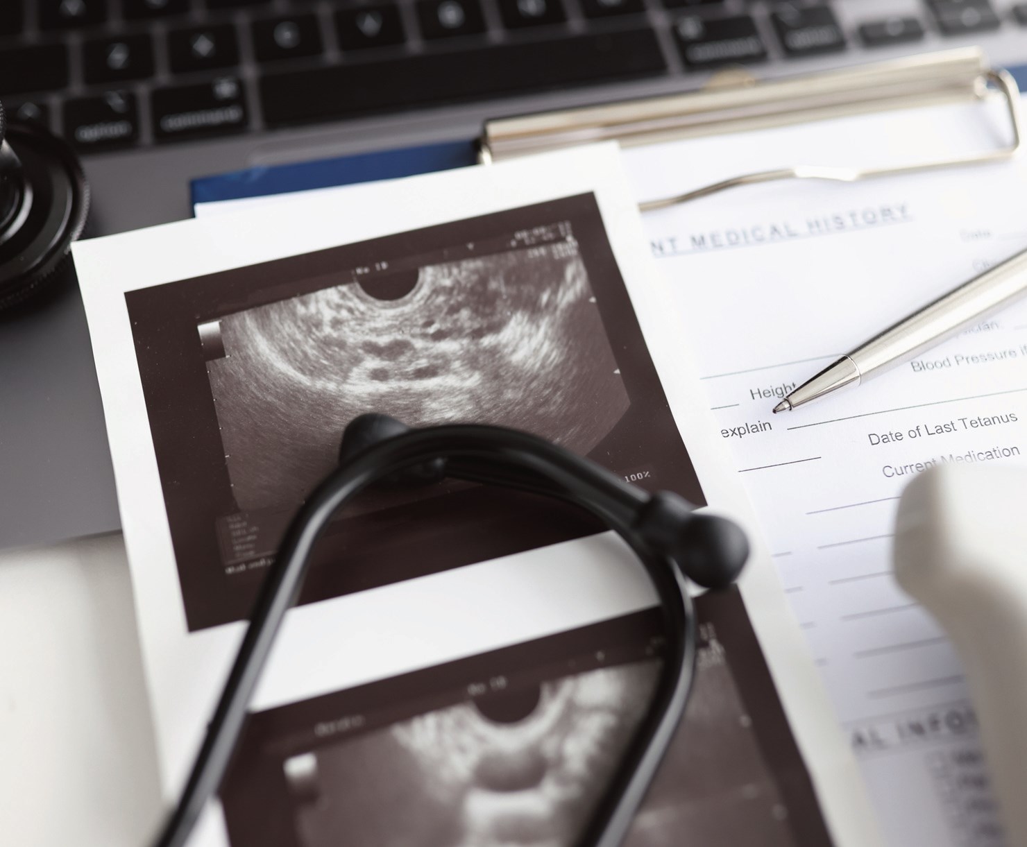 Modern ultrasound device with sensor and ultrasound of uterus. STOCK PHOTO