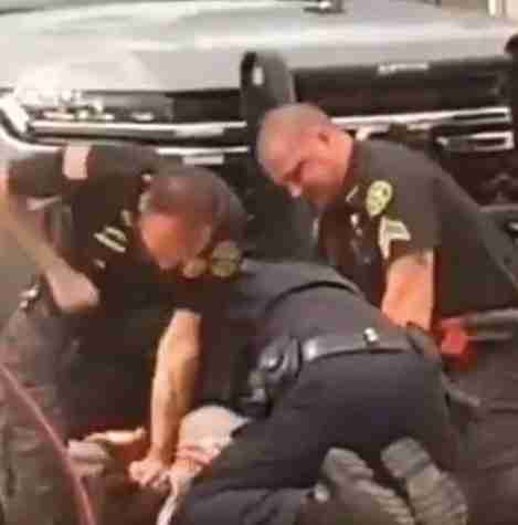 The video shows one officer punching the suspect with a clenched fist, while another can be seen hitting the man with his knee. The third officer holds him against the pavement.