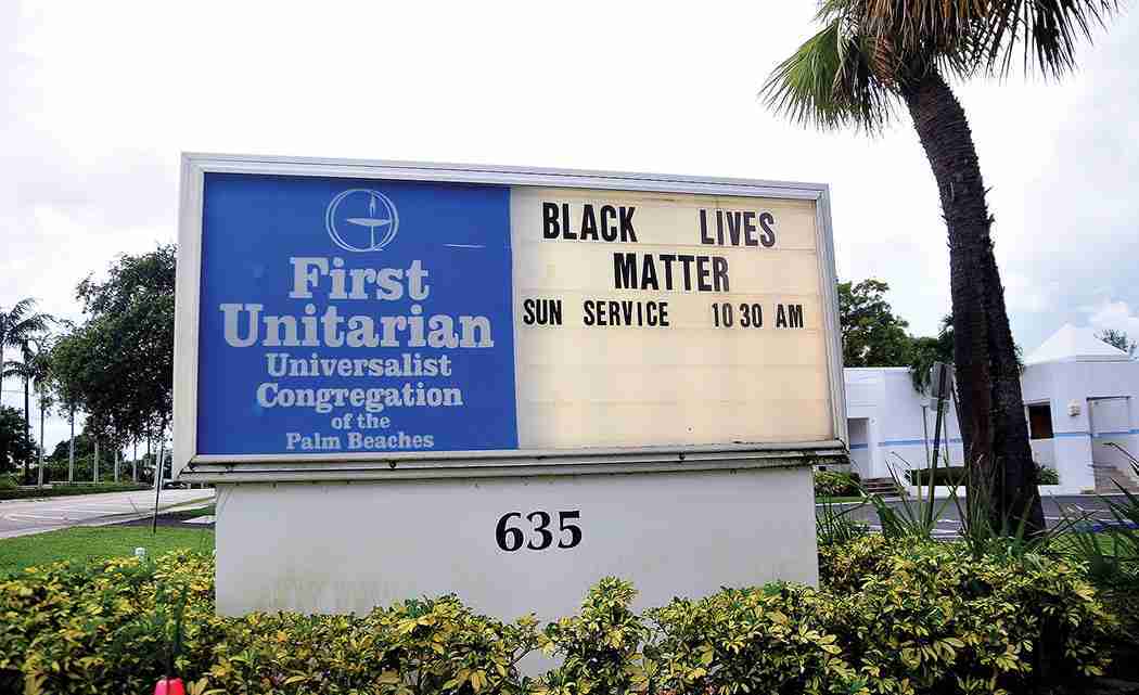 This is not the first time a Unitarian church has been hit with vandalism and/or criticized for supporting Black Lives Matter. Unitarian churches in Maryland, Nevada, Wisconsin, Missouri and Illinois have suffered the same fate. And about an hour north of First Unitarian church of the Palm Beaches, a Unitarian church in Vero Beach has had its Black Lives Matter sign defaced twice.