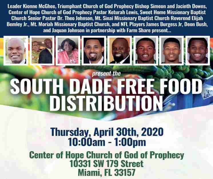 FARM SHARE FOOD DISTRIBUTION APRIL 30 IN WEST PERRINE: State Rep. Kionne McGhee, Bishop Simeon and Jacinth Downs, Pastor Keturah Lewis, Pastor Dr. Theo Johnson, Rev. Elijah Bemley Jr., homegrown NFL Players James Burgess Jr., Deon Bush and Jaquan Johnson are partnering with Farm Share for a free food distribution to benefit the South Dade community and surrounding areas in Florida House District 117. The Free Food "Drive Through" Distribution will be Thursday, April 30 at 10 a.m., at the Center of Hope Church of God of Prophecy, 10331 SW 179 St., Miami. The event will be drive through only. No walk-ups will be allowed.