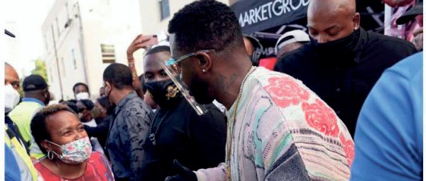 He was joined by his children at the event set up to help Overtown neighborhood residents facing economic hardship during the pandemic.