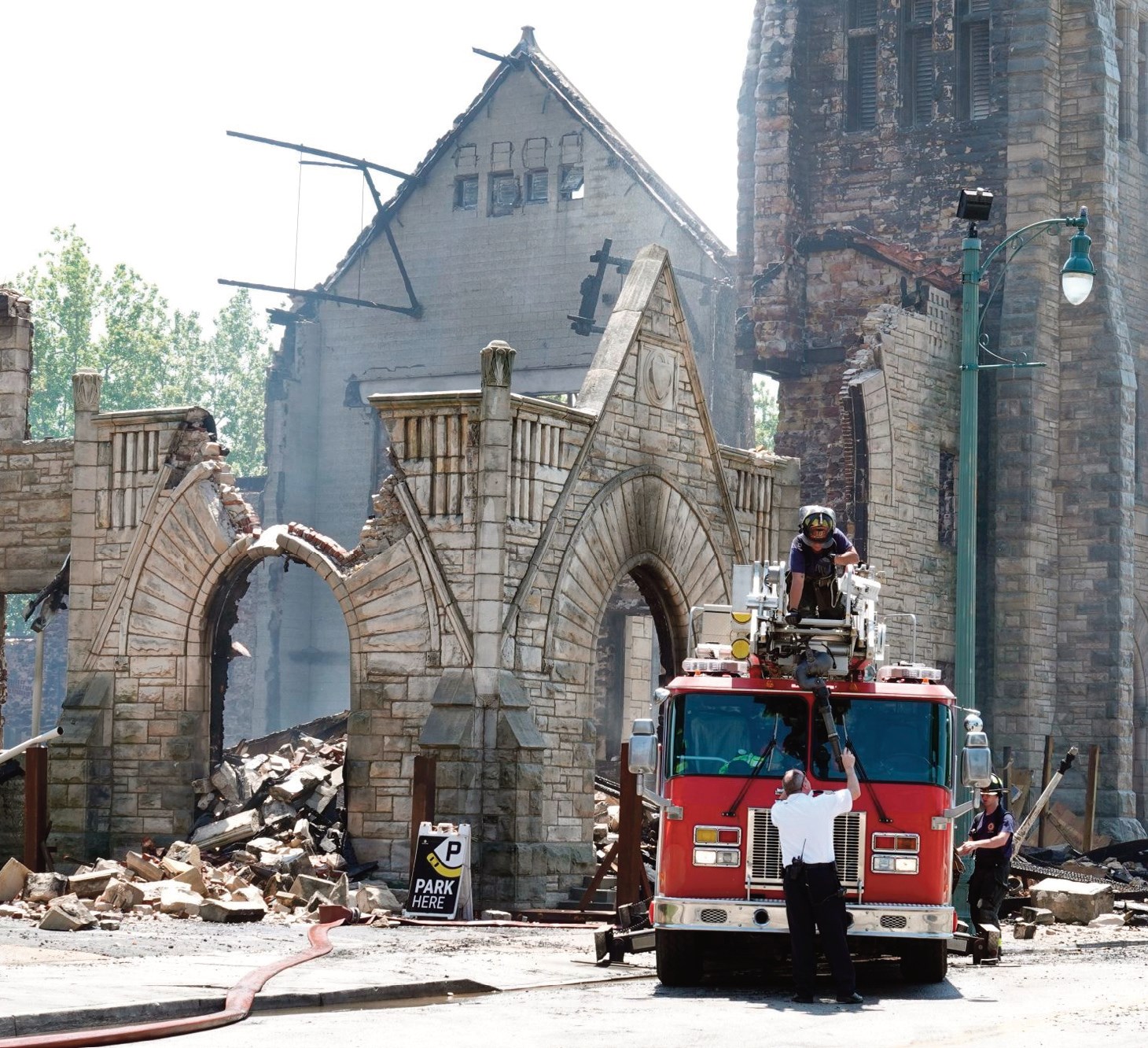 Fire crews at the smoldering remains of Clayborn Temple PHOTO COURTESY OF PSRMEMPHIS.ORG