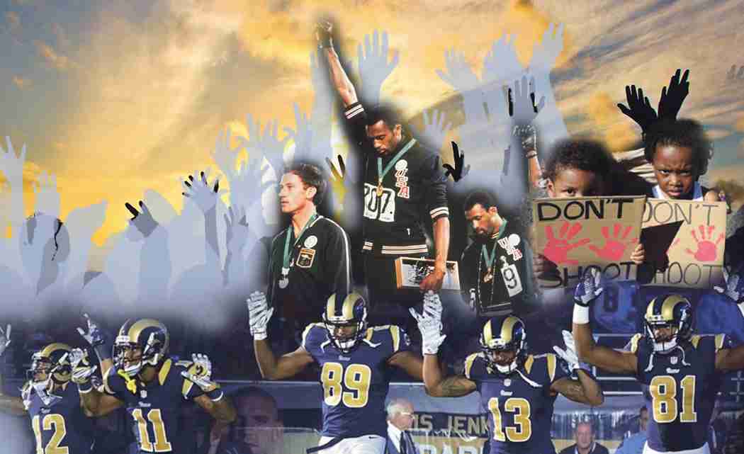 The episode recalled a famous one that occurred more than four decades ago at the Mexico City Summer Olympics in 1968, when the U.S. was roiled by racial turbulence.
