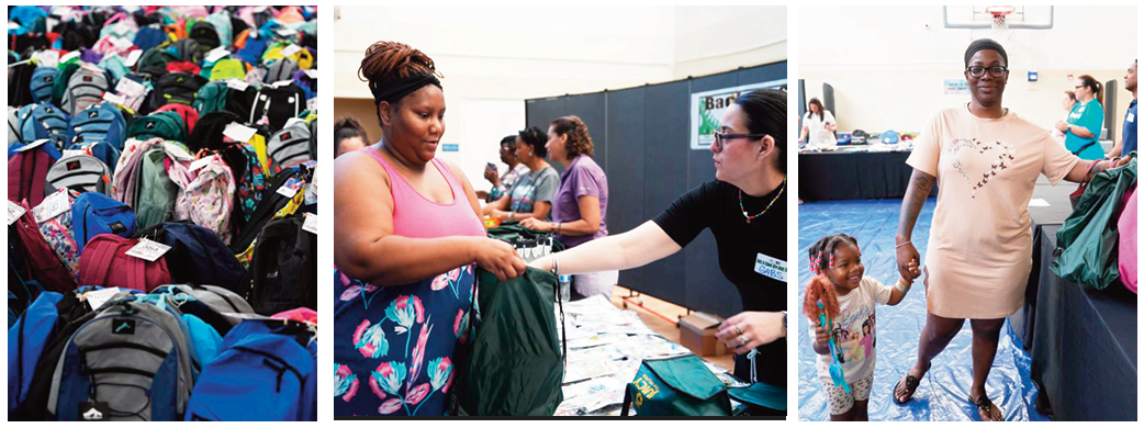 Families were warmly welcomed by volunteers, walked through tables filled with essential back-to-school items, and were offered cold water while waiting in the summer heat.