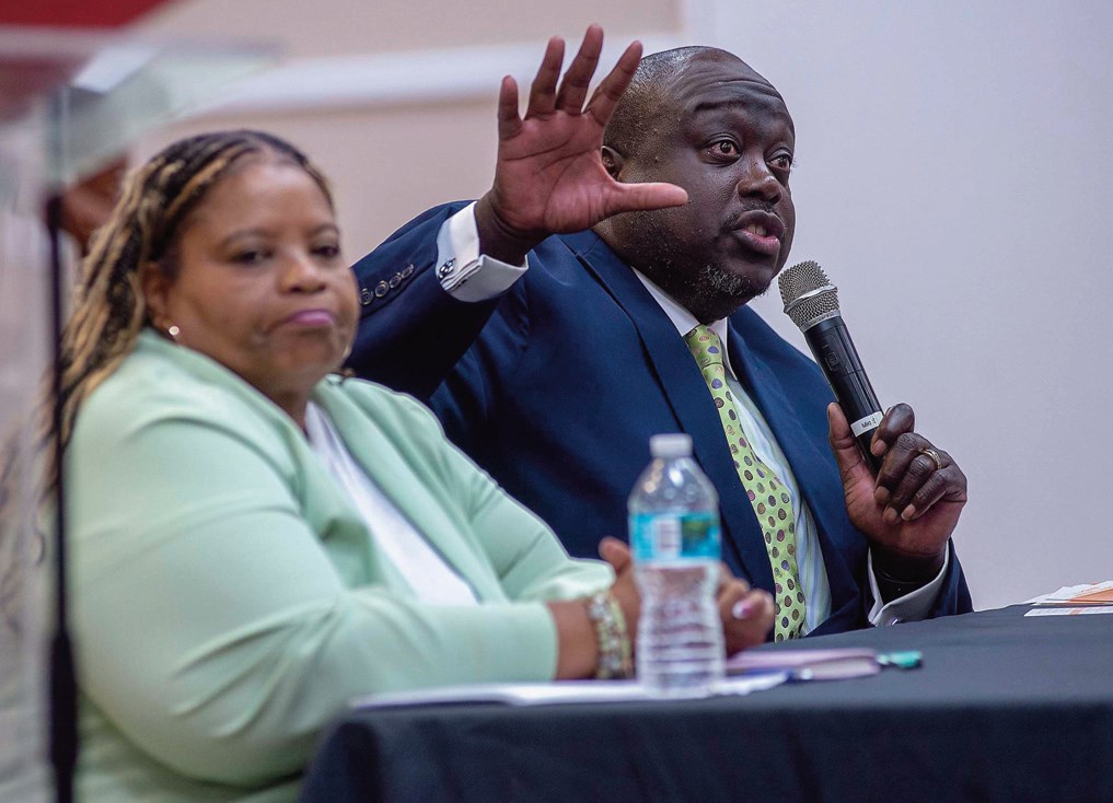 Riviera Beach – Voters heard from two sets of Riviera Beach City Council aspirants Tuesday during the first of two candidate forums this week ahead of the March municipal elections. Jeanette Gordon, president & CEO of McArthur’s Own, served as moderator for Tuesday’s conversation at J.A.Y. Outreach Ministries, with, below from left, incumbent Shirley Lanier, and Cedrick Thomas, a former councilman, vying in District 3; and incumbent Tradrick McCoy, chair pro tem, and Bruce Guyton, also a former councilman, in District 1. The candidates are set for a second round today, Feb. 20, 7 p.m. at the city’s Marina Village, 190 E. 13th St., with moderator Allahandro Bradford.