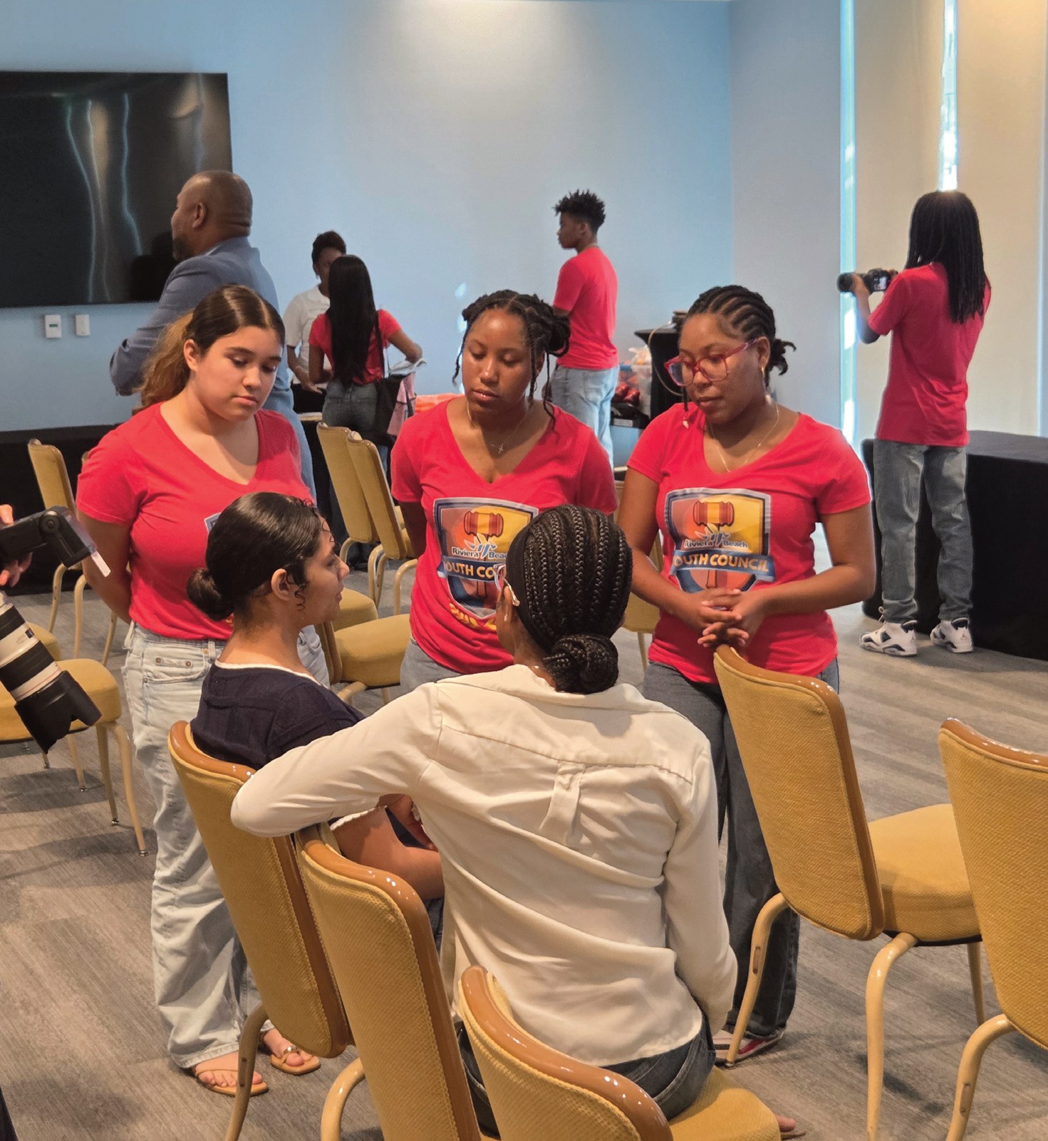COMMUNITY VOICES: The innovative initiative will train and pay high school students to document the city’s sweeping changes. Community Voices members Marielys Solano and Mikala Graham, seated above, chat Saturday with members of the new Riviera Beach Youth Council, subject of an upcoming Community Voices’ report for which member Kelvin Verhovlyak captured the photos at the Riviera Beach Marina. Reporting from a Riviera Beach City Council meeting last week, below from left, were Community Voices’ Abigail Guillaume, Graham and Etienne. During a recent training session in their school newsroom, their classroom, Community Voices’ Myles Whigham, below right, with special guest Samantha Ragland and Stet News co-founder Liz Capozzi, as Guillaume checks her camera. More photos Page 6B.