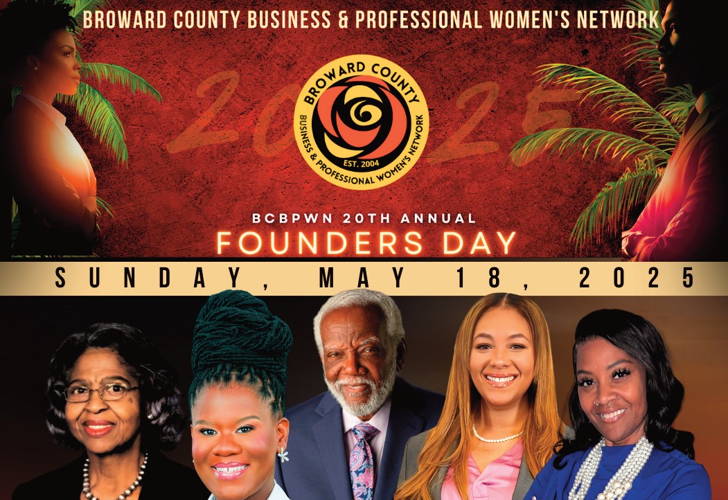 FOUNDERS DAY: “The Broward County Business and Professional Women’s Network, Inc. (BCBPWN) presents its 20th Annual Founders Day Celebration on Sunday, May 18 at the Miramar Cultural Arts Center, 2400 Civic Center Place, Miramar. The celebration begins with an xxx reception at 2 p.m. followed by the main program at 3 p.m. contact Dr. Deborah Jones, event chair, 305-343-4282 or bcbpwn.nanbpwc@gmail.com.