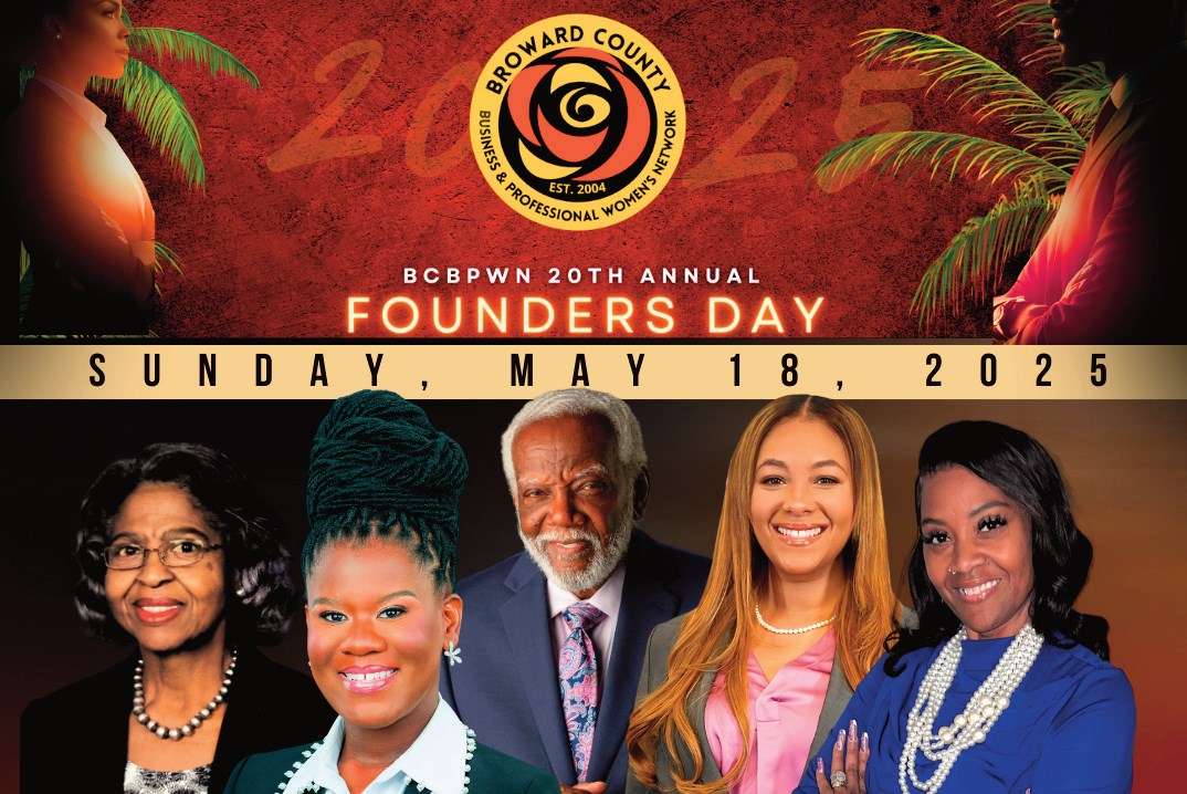 FOUNDERS DAY: “The Broward County Business and Professional Women’s Network, Inc. (BCBPWN) presents its 20th Annual Founders Day Celebration on Sunday, May 18 at the Miramar Cultural Arts Center, 2400 Civic Center Place, Miramar. The celebration begins with an hors d’oeuvres reception at 2 p.m. followed by the main program at 3 p.m. contact Dr. Deborah Jones, event chair, 305-343-4282 or bcbpwn.nanbpwc@gmail.com.