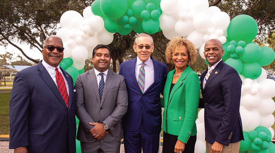 ACCELERATING OPPORTUNITIES: From left, West Palm Beach Mayor Keith James, Gopal Rajegowda, Stephen Ross, Palm Beach State College President Ava Parker and Eric Kelly celebrating $8 million gift Monday. PHOTO COURTESY OF PBSC
