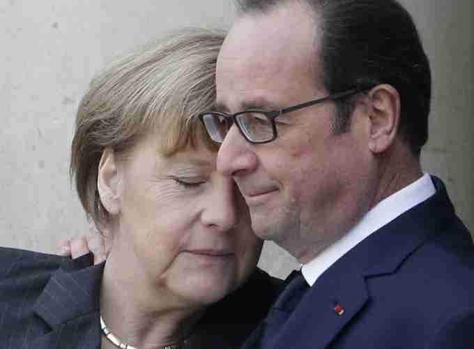French President Francois Hollande embraces German Chancellor Angela Merkel, left, as she arrives at the Elysee Palace, Paris, Sunday, Jan. 11, 2015. A rally of defiance and sorrow, protected by an unparalleled level of security, on Sunday will honor the 17 victims of three days of bloodshed in Paris that left France on alert for more violence. (AP Photo/Thibault Camus)