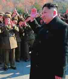 North Korean leader Kim Jong Un stands before an adoring crowd of military personnel.