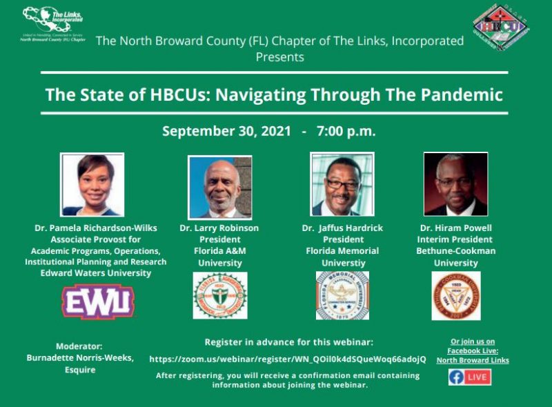 THE STATE OF HBCUS: The North Broward County Florida Chapter of The Links, Inc. hosts a virtual webinar leadership forum featuring the university presidents providing information on how they are navigating through the coronavirus pandemic., Thursday, Sept. 30, 7 p.m. Participants must register to attend, see above details or call 305-775-7155.