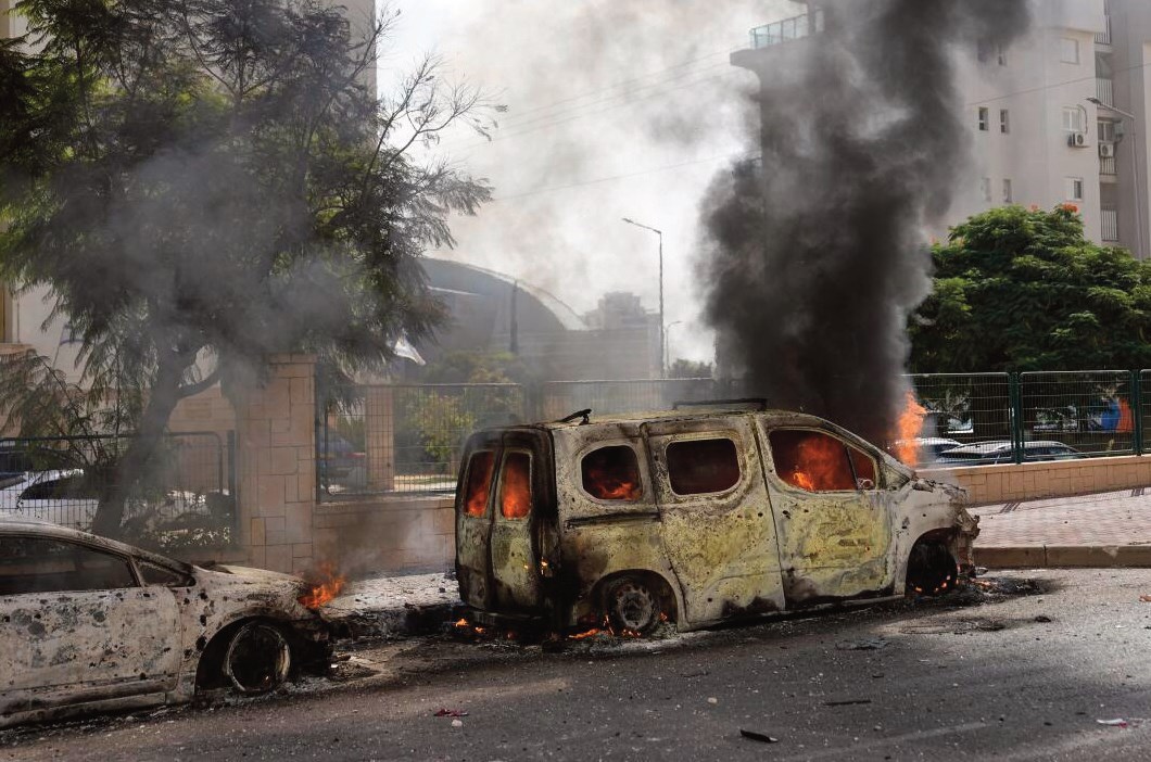 Cars are on fire after they were hit by rockets from the Gaza Strip in Ashkelon, Israel, on Saturday, Oct. 7, 2023. PHOTO COURTESY OF X.COM