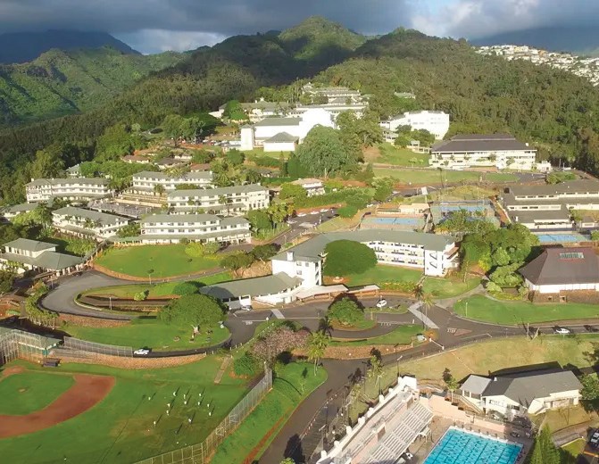 Along with a breathtaking ocean view, the sprawling Honolulu campus boasts top amenities — an Olympicsized pool, buffet lunches, athlete laundry service and grounds adorned with native plants. An annual, elaborate Hawaiian song contest between high school classes is broadcast on local TV.