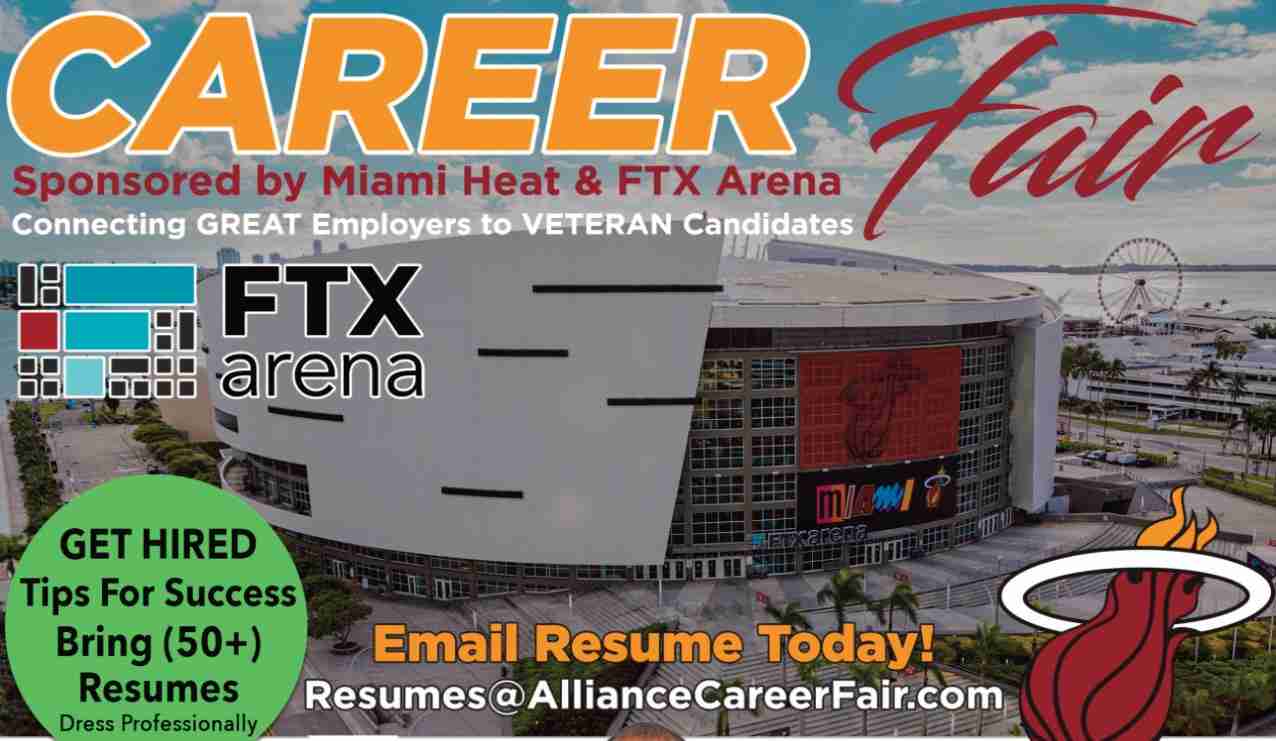 CAREER FAIR BY THE MIAMI HEAT & FTX ARENA: Plan on meeting human resource professionals, recruiters, and hiring managers from more than 40 firms representing more than 100 brands, Thursday, Aug. 25, 10 a.m. – 2 p.m., Miami HEAT FTX Arena, 601 Biscayne Blvd., Miami. More than 1,000 career opportunities, part-time, full-time, hybrid, and 100% remote positions ranging from $20 to $50 per hour or $42,000 to over $100,000 per year and up. Many companies are committed to hiring veterans and encourage them to attend, as well as general public career seekers. Attendees must bring their updated resumes (50 printed copies), dress professionally for on-the-spot interviews, offers, and prepare to speak with employers with open positions from in office, hybrid, and 100% remote positions at the in-person Career Fair, taking place at the Miami HEAT FTX Arena. National and local companies from all industries including the Miami Heat, FTX Arena, healthcare, information technology (IT), engineers, banking, gaming, aviation, manufacturing, hospitality, retail, government and more are seeking entry level, supervisors, managers, project managers, directors, vice presidents to executive management candidates. Veterans are encouraged to attend. All Attendees are asked to park at the P2 Parking Garage and enter at Gates 1 and 2. Free parking will be validated with printed resume. Please email resumes for advance consideration to resumes@alliancecareerfair.com.