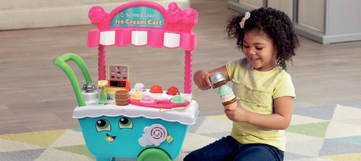• Ice Cream Fun: By pretending to run their own ice cream cart, kids can create a variety of imaginative and tasty-looking ice cream combinations. And the Scoop & Learn Ice Cream Cart helps them build memory and sequencing skills, as it comes with six cute animal order cards that encourage little ones to follow the instructions. The cart also features playful phrases to introduce colors, numbers and flavors, and plays upbeat songs and music when pushed.
