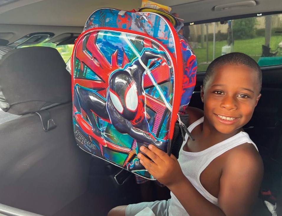 BLESSING THE COMMUNITY IN NEED: Child with his new Spiderman backpack. Volunteer loading backpacks into car. Volunteer loading food into trunk. Line of guests waiting for event. PHOTO COURTESY OF THE CARING PLACE