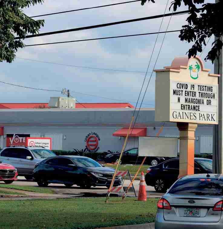 CORONA BACKUP: The line for covid testing yesterday morning at Gaines Park, across from the Urban League headquarters in West Palm Beach, stretched south from 25th Street past the park on Australian Avenue, then west along Palm Beach Lakes Boulevard, before circling to the park’s west entrance. An official said that when testing opened at 9 a.m., a driver stated he had been waiting in line since 2:30 a.m. Officials said they planned to stop the traffic by 1 p.m. Wednesday, to allow for processing by the 5 p.m. closing time of those already in line.
