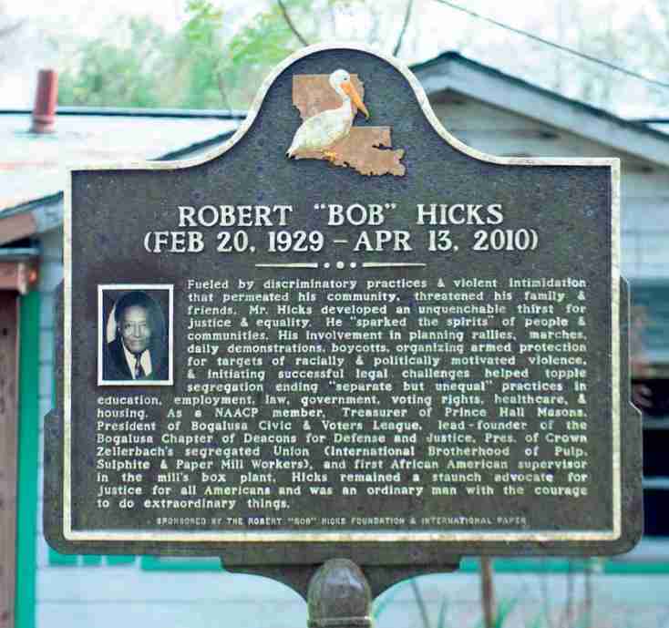 Hicks founded the Deacons of Defense and Justice chapter in Bogalusa and later served as president of the BCVL. Hicks joined with civil rights activists A.Z. Young and Gayle Jenkins to help lead the Bogalusa-to Baton Rouge March in 1967. The march grew from 25 to 600 people over the course of its 105-mile (170-kilometer) journey and required protection from National Guardsmen and police. Last August, a similar marker was installed at A.Z. Young Park in Baton Rouge honoring those who participated in that march.