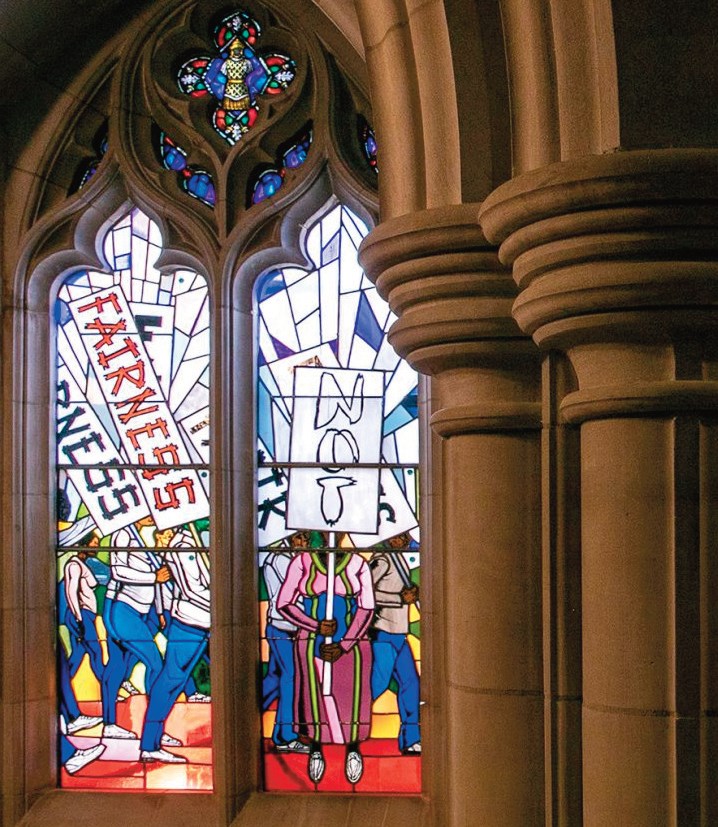THEME OF RACIAL JUSTICE: The new windows depict a march for justice by African Americans, descendants of the very people who would have remained in slavery after the Civil War if the side for which the officers fought had prevailed. PHOTO COURTESY OF CATHEDRAL.ORG