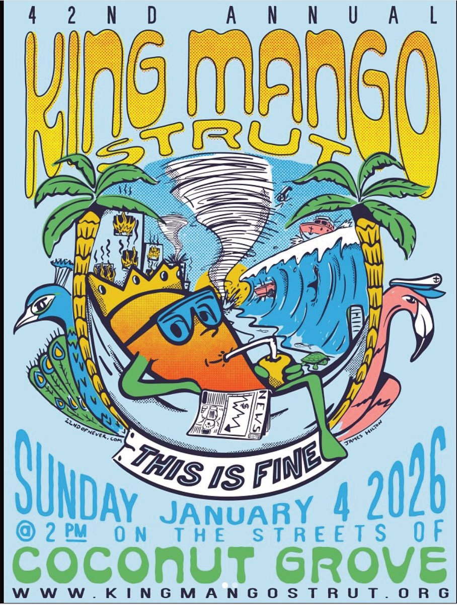 Miami— The Coconut Grove Business Improvement District (BID) is proud to sponsor the return of the beloved and iconically off-beat King Mango Strut parade. This year’s Strut will take place on Sunday, January 4, 2026, beginning at 2 p.m., winding through the charming streets of Coconut Grove, and promising an afternoon of laughs, community spirit, and creative expression.