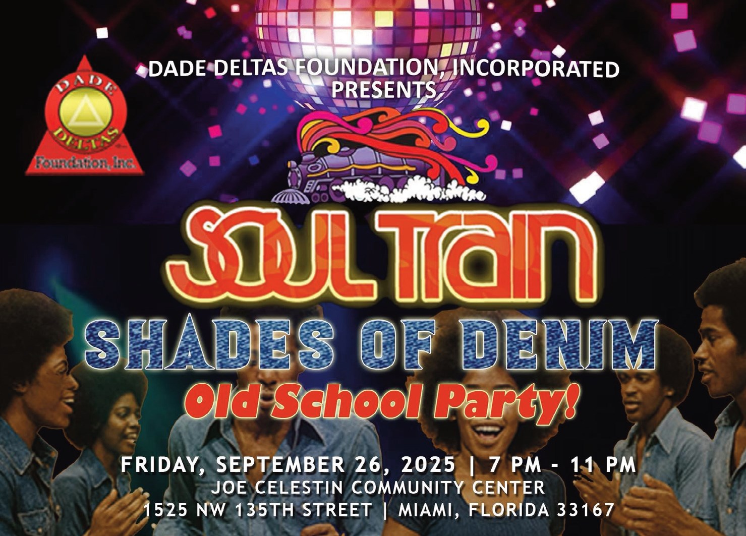 OLD SCHOOL PARTY: The Dade Deltas Foundation Inc. presents a Soul Train Shades of Denim scholarship fundraising event, Friday, Sept. 26, 7 – 11 p.m., at the Joe Celestin Community Center, 1525 NW 135th St., Miami, featuring live entertainment and DJ, cash raffles and giveaways, 305 Sliders Line Dancers, BYOB, BYOF. Donation $50 per person, CashApp $DadeDeltas2021 by 9/20/25. Tables of eight. Contact: Dadedeltasfoundation@gmail.com